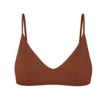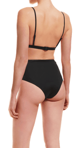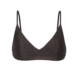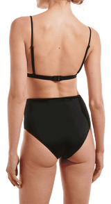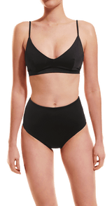 This flattering triangle shape bikini top has thin adjustable shoulder straps and is fastened with an engraved black metal clasp, giving the piece a slender and minimalistic look from behind. An under-bust band in front ensures proper bust support and an easy fit. Made out of double layered fabric, with an excellent shape retention, this style best fits small and medium bust sizes.
