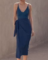 An easy effortless cover up for the beach days. Wear it as a wrap skirt or a relaxed halter dress, knotted at the back of the neck. Easy to pack, made out of light weight high quality recycled polyester that doesn't wrinkle.